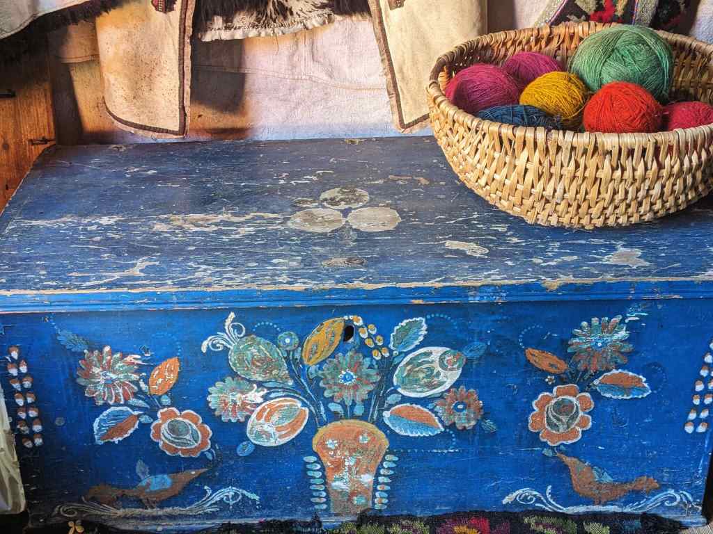 У Чагрі багато небесних акцентів (блакитного кольору) і пташиної символіки. Це виразно видно із колекції автентичних мальованих скринь, а також із мальованого на склі хреста. Із килимів з лелеками.
