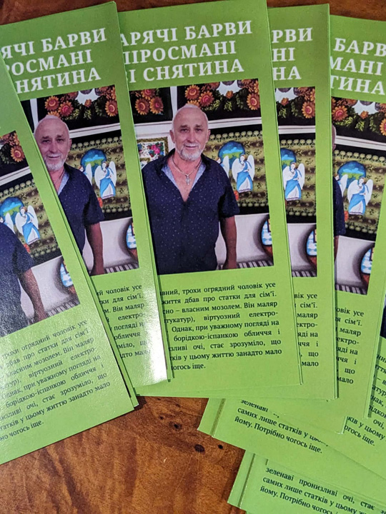 Традиційні фольклорні та сакральні сюжети, переосмислені творчою уявою митця, вміщені на фабричні хустки-метрівки. Вони заговорили до відвідувачів так, як промовляють народні покутські мальовані килимки чи східні мандали. Товариство зібралося направду розмаїте: гості зі Снятинщини (Снятин, Красноставці, Підвисока), Чернівців, Кропивницького, Великого Кучурова, Снячева, Одеси, а також Мюнхена та Лондона відвідали захід, що випромінював одну з найвищих людських чеснот — щирість.