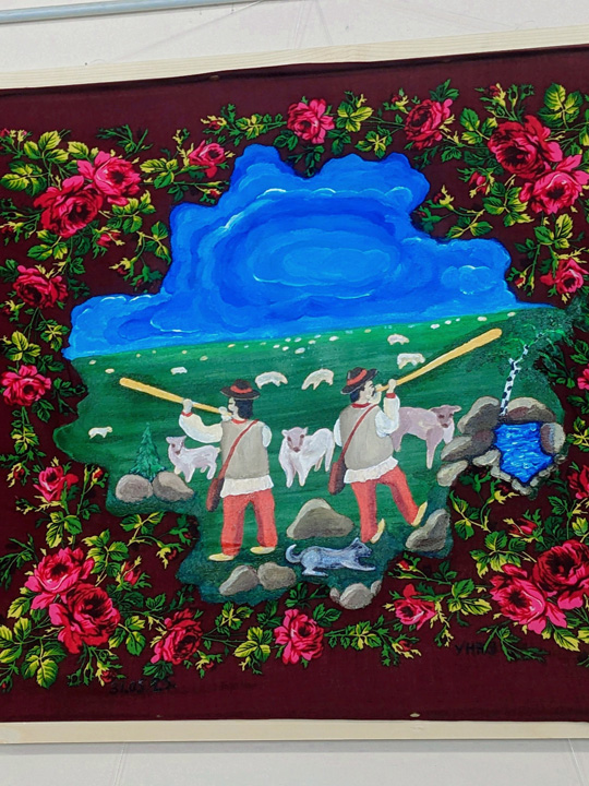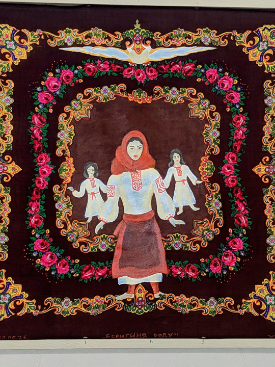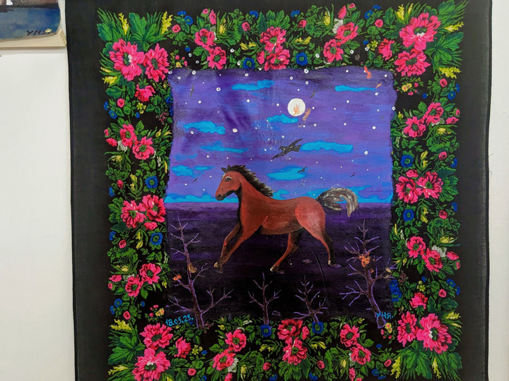 «Я назвав виставку «Україна на маминих хустках», бо насправді кожна хустина — це не просто річ у шафі чи скрині, це спогад про найдорожчу жінку життя — маму. Хустина — це завжди дуже особисте. Тому я вирішив поєднати свої малюнки з нашими хустками. Хочу, аби кожен подумав про те, що найближче серцю», — розповідає Іван Угрин.