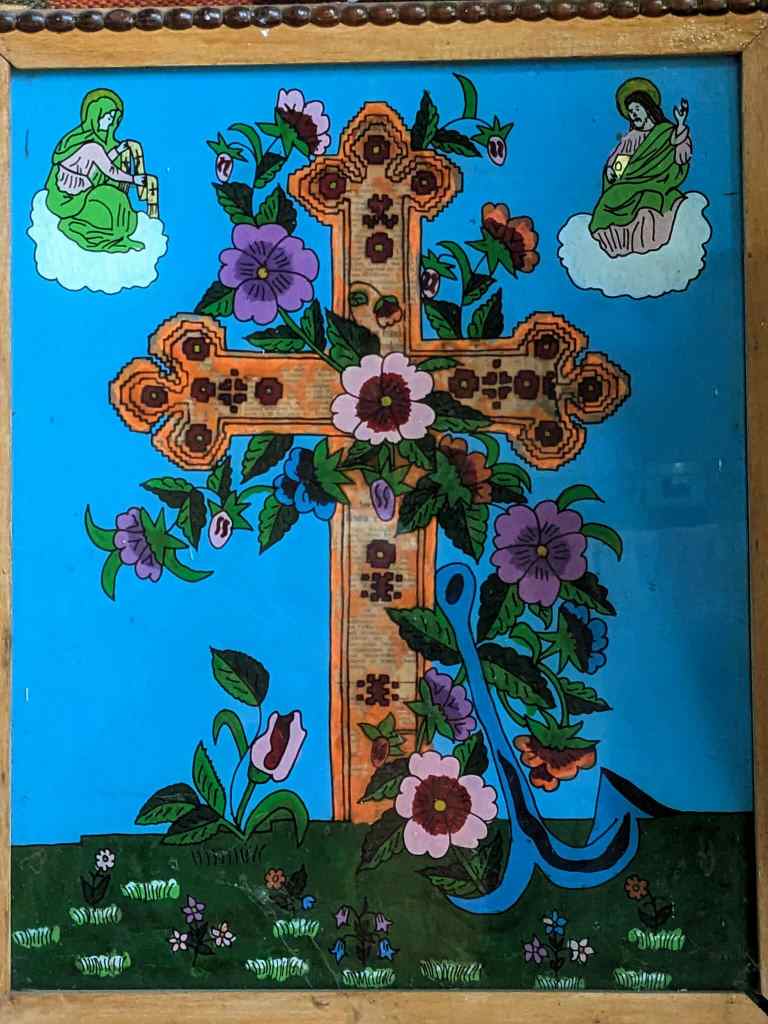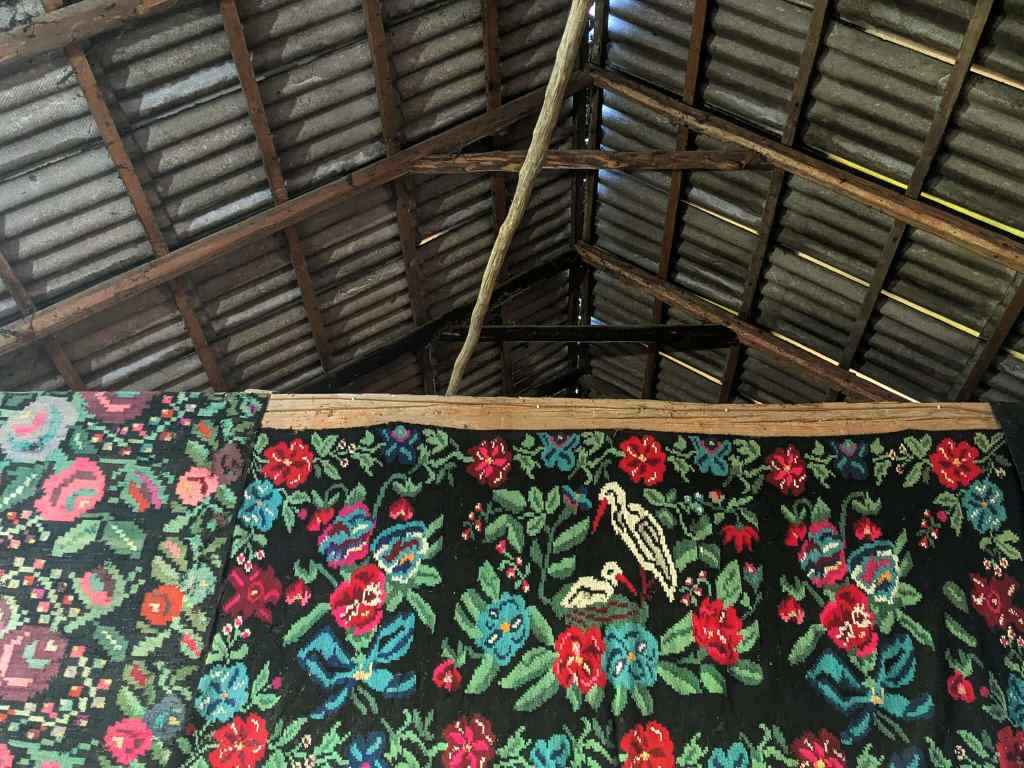 У Чагрі багато небесних акцентів (блакитного кольору) і пташиної символіки. Це виразно видно із колекції автентичних мальованих скринь, а також із мальованого на склі хреста. Із килимів з лелеками.