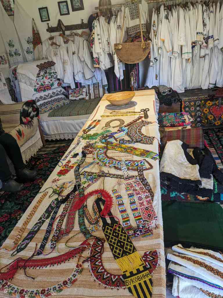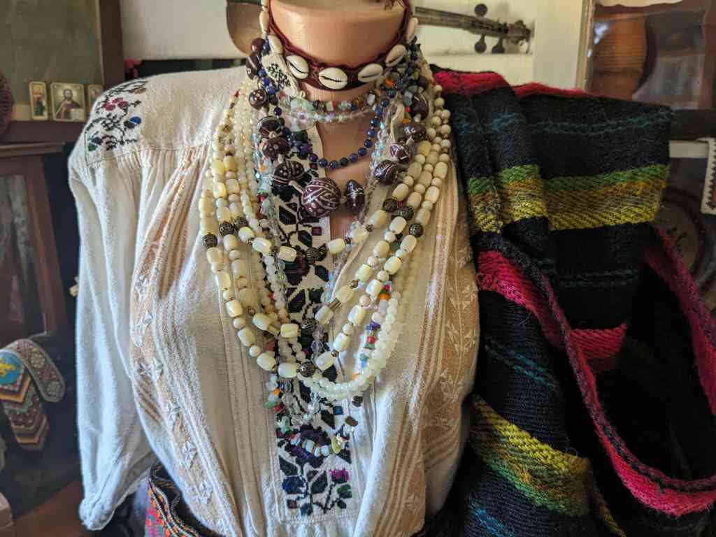 Вони з чоловіком Андрієм – не чагорські. «Парашутисти», - як жартує пані Наталія. Пан Андрій родом із Тернопілля, пані Наталія – з Ломачинців на Сокирянщині, вони разом проживали у Чернівцях. І в якийсь момент за покликом серця купили хату в Чагрі, де Наталія облаштувала простір з колекцією старожитностей. Деякі з них куплені разом із хатою, деякі придбала підчас експедиційних пошуків, деякі (наприклад, родинні сорочки-червонєнки) – ломачинські. Тоді ж майстриня захопилася виготовленням бісерних прикрас – силянок, ґерданів, котильонів. Що цікаво, у Чагрі, як і ще в кількох ближніх селах, ґердан називають «зґардіца», хоча «зґарда» в звичному розумінні – це прикраса з одним чи кількома хрестиками. Друга місцева особливість полягає в тому, що в більшості сіл Буковини ґердан розетковий (а особливо із дзеркальцем) є суто чоловічою прикрасою, тут же є численні архівні світлини кінця ХІХ-початку ХХ століття, де у таких прикрасах – молоді жінки. Наша традиція промовисто показує, що є загальний традиційний канон, а є місцеві особливості, які відкриваються лиш перед уважними.