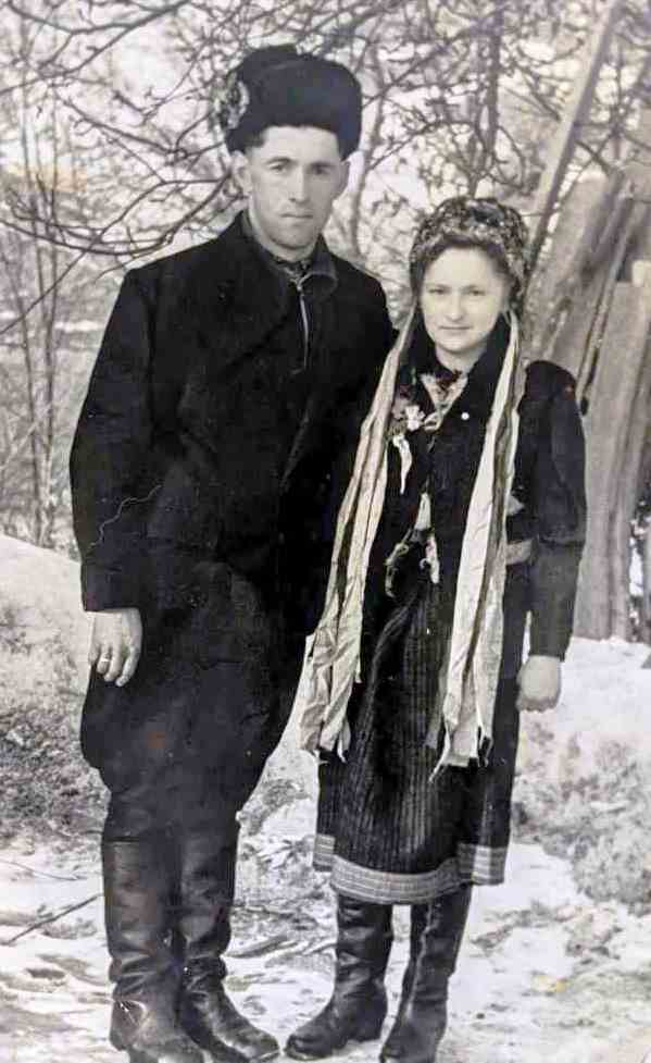 «Що я запам’ятала з тих минулих років – наші дружби на весіллю (парубки-друзі молодого) мали бути всі з топірцями. Вони були ніби ватага від молодого. В суботу у нас си зачинали заво́дини, це ніби як початок весілля. На заводинах клонє шитий вінок і збирают деревце. І от як це відбувається у домі молодої. Вона сідає на столец, на тому стільці є подушка. Молода сіла – дєдя і неня чешут їй косу. І тогди берут шитий вінок, кладут на калачі і три рази клонє. Це ніби благословення хлібом. Потому всі, хто були при цім, сідают за стив, молода три рази обходит стив, тогди берут зібране весільне деревце, загуляют гуцулку, і тогди молода іде до кли́каня (запрошувати гостей на весілля). Наперед (за тиждень чи два) у нас в давні роки не кликали, а отак, як я кажу – в суботу на заводинах. Поки молода пішла кликати – в буді данці для молоді, столування, набутки. Приходив собі хто хотів. І от прийшла молода з кликаня, обійшла усіх, кого мала на вісілє закликати, загуляла пару данців ще з молодіжжю в палатці, і вже її ніхто не розбирає – маю на увазі з того вінка. Отако у вінку спит на руках, би то не поклема́цкалоси. Бо на другий день – вінчіні.
