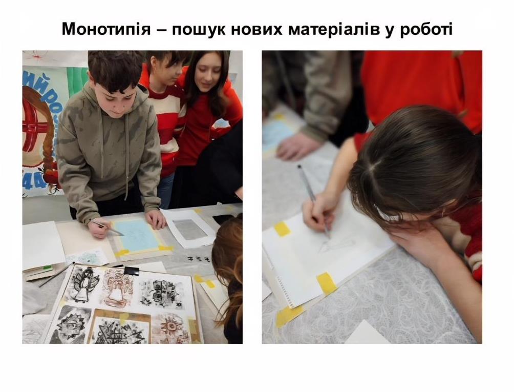 Свої методичні напрацювання на вебінарі презентували Зоряна Кіфуляк - викладачка КУ «Новоселицька художня школа» та Ельвіра Мазур - викладачка КЗ «Кельменецька художня школа». Методична доповідь Зоряни Кіфуляк була присвячена техніці монотипії та експериментальному пошуку нових матеріалів у роботі викладача мистецької школи. У доповіді викладачка ґрунтовно розкрила сутність техніки монотипії як унікального виду друкованої графіки, що поєднує елемент випадковості з авторським контролем. Авторка доповіді послідовно висвітлила етапи роботи над композицією, продемонструвала приклади завдань для своїх учнів, а також довела, що монотипія є ефективним інструментом розвитку образного та асоціативного мислення, фантазії та вміння імпровізувати, композиційного бачення, емоційної виразності роботи, впевненості у власному творчому рішенні.